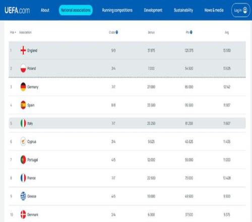 欧战系数平均积分:英超13.93分暂列第一,德甲第三西甲第四