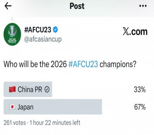 亚足联官推发起了对最终夺冠球队预测的投票,其中33%的球迷支持U23国足夺冠,67%的球迷更看好日本U23夺冠。