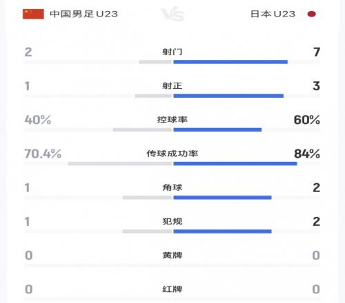 25分钟U23国足0-2落后。日本U23在上半场25分钟7次射门3次射正2个进球,控球率60%;中国U23有2次射门1次射正,控球率40%