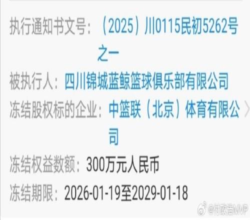 媒体人:四川男篮持有的CBA公司5%股权被法院冻结冻结期限为三年