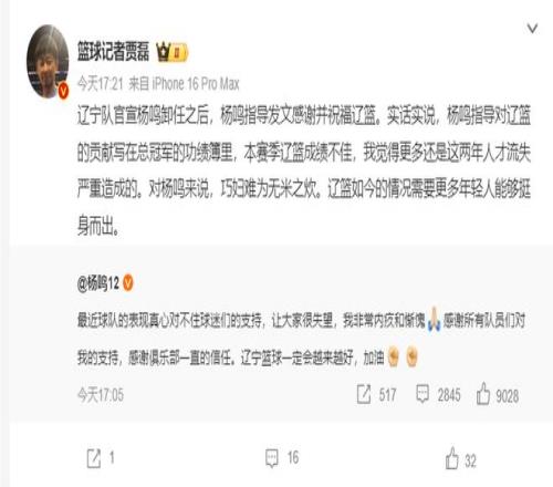 杨鸣辞职登热搜!大V不满其成辽篮替罪羊球迷狂刷杨导脱离苦海