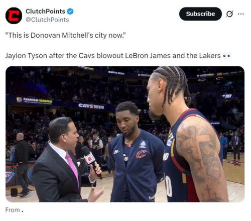 泰森没有让米球回答,他抢答:这里现在是米切尔的城市,骑士队是米切尔的球队,当勒布朗回到这里,我们会像给勒布朗加油一样为米切尔呐喊,这是属于米切尔的时刻,这里是他的城市。