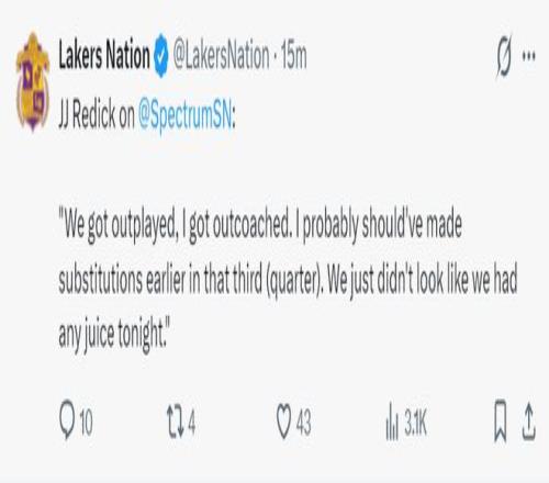 赛后雷迪克点评了这场比赛,他非常不满意:我们被骑士打得毫无还手之力,我的战术安排也出现了失误,第三节早些时候我就该进行人员调整。这场比赛我们根本没有展示出应有的实力。