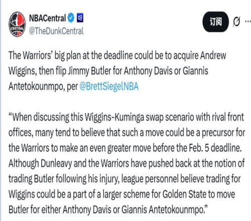 北京时间1月29日,据名记布雷特-西格尔报道,勇士队在交易截止日的计划可能分为两步:先通过交易得到安德鲁-维金斯,再用吉米-巴特勒作为筹码,去换浓眉或字母哥。