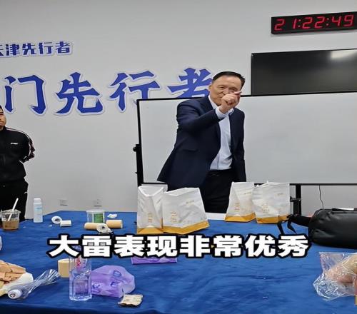 贵叔说到这里,举起手来,指着一名队员说,“今天哪个谁?(用手指着雷诺兹)然后大声说:大雷表现非常优秀!更衣室再次响起掌声,为2米1身高的雷诺兹喝彩。张德贵最后强调,继续努力,加油。众人拉起手来,张德得意地宣布:上午休息,下午练点力量!也许这就是给队员的奖励,说完69岁的老帅在脸上顿起了笑容。
