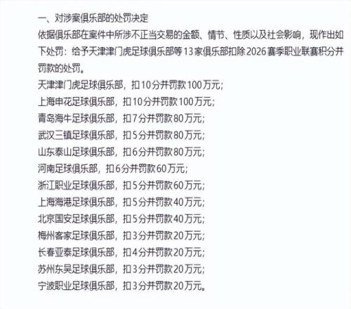 从这份公布的涉假球名单上来看,上海申花和天津津门虎是扣分最多的球队,每一支球队的扣分是10分,外加罚款100万元,紧跟着是青岛海牛扣7分,山东泰山、河南扣6分,武汉三镇、上海海港、北京国安扣5分,梅州客家扣3分、长春亚泰扣4分外加罚款。