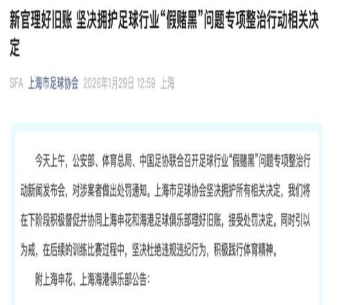 1月29日,上海市足球协会发文:今天上午,公安部、体育总局、中国足协联合召开足球行业“假赌黑”问题专项整治行动新闻发布会,对涉案者做出处罚通知。上海市足球协会坚决拥护所有相关决定,我们将在下阶段积极督促并协同上海申花和海港足球俱乐部理好旧账,接受处罚决定。同时引以为戒,在后续的训练比赛过程中,坚决杜绝违规违纪行为,积极践行体育精神。
